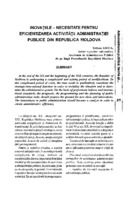 Inovaţiile - necesitate pentru eficientizarea activităţii administraţiei publice din Republica Moldova At the end of the XX and the beginning of the XXI centuries, the Republic of Moldova is undergoing a complicated and aching period of modifications. In this complicated period of crisis, the state needs to qualitatively reanimate the strategic-innovational function in order to revitalize the situation and to deter mine the administrative system. On the basis of performant indexes and interna tional standards, the prognosis, the programming and the planning of public administration tasks should prepare the ground for new ideas and innovations. The innovations in public administration should become a catalyst in order to obtain administrative efficiency.