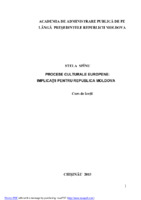Procese culturale europene: implicații pentru Republica Moldova: Curs de lecții Lucrarea propune o viziune interdisciplinară asupra temei vizate în titlu, investigaţia fiind efectuată din perspectiva culturologiei, a științelor politice, lingvistice şi sociologice. Suportul metodologic şi teoretico-ştiinţific al lucrării este constituit din investigaţii mai vechi şi mai noi, ale căror contribuţii ştiinţifice sunt recunoscute şi apreciate.