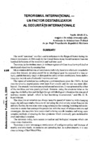 Terorismul internațional - un factor destabilizator al securităţii internaționale The word "terrorism" was first used in reference to the Reign of Terror during the French Revolution. A1988 study by the United States Army found that more than one hundred definitions of the word exist and had been used. Terrorism, in the modern sense, is violence against civilians to achieve political or ideological objectives by creating fear. Most common definitions of (errorism include only those acts which are intended to create fear (terror), are perpetrated for an ideological goal (as opposed to a lone at tack), and deliberately target or disregard the safety of non-combatants. Some defini tions also include acts of unlawful violence and war. The aspect of terrorism has undergone a metamorphosis since the 1960's. At that time the terrorist organizations were more Euro centric and the war was more ideo- logical. The crusade was between capitalism and socialism. It was sponsored by either of the two blocs and was purely political. However, today the situation varies as the target has shifted to Asia and the fight though still ideological is based on the concept of mid-east centric 'jehad', which is fast becoming international," said Mr. D. R. Kaarthikeyan. The objective of terrorists has always been the spread of terror but with changing times, the militants tend to focus on all including the civil society rather than just the military. Earlier, the terrorists were using techniques like warning, bombing and assas¬ sination to create fear amongst the people but with the onset of religious notions and stereotypes, the terrorists have succumbed to being suicide bombers and using more complex methods of creating the fear syndrome which eventually gets enshrined in every individual's mindset. The terrorists today, have access to nuclear and biological weapons which can cause mass destruction. Terrorism is soon becoming a continuation of a religious policy and because of readily available funds, its tentacles are spreading fast. As a phenomenon, it is very close to being a Third World War.