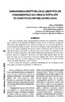 Garantarea drepturilor şi libertăţilor fundamentale ale omului stipulate în constituţia Republicii Moldova The issue of human rights and fundamental liberties has registered a remark able evolution in the Republic of Moldova lately. It was carried out through the elaboration and adoption of new drafts of normative acts and the implementa tion of legal provisions in force. The gravity of human rights infringements im pose to the whole population the desire to know extensively and be aware of the imperative norms in the field, so that the state coercive force be adequately exer cised by its legal institutions. The people should feel protected by the state insti tutions, which are obliged to intervene each time when human rights are vio lated. In order for the given idea to become tangible, the citizens should know the means they have at their disposal in order to eliminate the causes and the effects of legal provisions contraventions. In this context the necessity to promote knowledge for the evaluation of hu man rights protection mechanisms is emphasized.