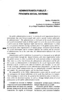 Administrarea publică - fenomen social sistemic The public administration system is "a system of social organization based on relationships that exist between people who carry a specific activity called pub lic administration ". The administration is both part of the social environment and social environment itself. Its ultimate goal is to serve the society that created it and to meet the human legitimate rights and interests. Administration is a body in a set of social structures having a primary place in the global society, which is inserted from other organizations or human groups structured hierarchically, lie social environment and its evolution influence the activity and the structure of Administration, but at the same time, the Administration influences the social environment. Administration and its institutions is presented as a structured set of ojficials and social bodies through the mutual relations with other organizations within the global society in order to perform the tasks pursued jointly or separately. Thus, there is a close link between the administrative phenomenon and the global society, as Administration is determined by the social organization whose demands it meets, as well as the collective behavior, and, therefore, we can real ize the sociologic explanation of the administration phenomenon. As part of the social system, public administration has two indispensable essential components and namely: the structural-organic and the functional elements. The compatibility of the Public Administration system with the overall social one presupposes the mutual admittance of the needs they both have in common. Tliis knowledge is achieved by the spread of the information flow in both direclions within the mentioned systems, as well as, through multiple forms of social participation of the public administration system.