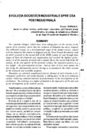 Evoluţia societăţii industriale spre cea postindustrială The constant changes, which have been taking place in the society in the course of its existence, prove that the evolution of humanity has never stopped. The industrial society, as a developmental stage of the human society, started with the Industrial Revolution in England and the Great French Revolution, both of which occurred in the second half of the XVIII century. It went through more stages of State development and organization and reached the highest perfor mance in all the domains of social and economic life by the second half of the XX century. In the last quarter of the previous century, the transition process to a new height - the post-industrial society - had its start. It bore more names, the last being the informational society, having at its foundation the whole arsenal of the technical and scientific progress. Nowadays, an extremely complicated process, formed of such elements as de velopment, perfection, and modernization, is taking place in the post-industrial society, which has attained unheard of performances in the development of the civilization. The tendency to a higher perfection is the imperative of the time and of the development of the modern society.