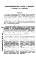 Налоговая система России: от анализа проблем к их решению The world economic-financial crisis confronted the states, the governments and the national parliaments with the task to elaborate and to adopt both reso lute and novel decisions in order to overcome it. What do the Russian authorities undertake in this respect? How do they face the situation? Is it possible for the fiscal system in this country to react adequately to the imminent challenges? All these questions are answered in the given article by a renown specialist in the field, former leader of a number of financial and fiscal institutions from Russia and member of the Council of the Federation Assembly of Russian Federation on behalf of Krasnodar region at present.