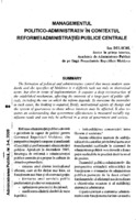 Managementul politico-administrativ în contextul reformei administraţiei publice centrale The formation of politica! and administrative control that meets modern standards and the specifics of Moldova is a difficult task not only in theoretical terms, but also in terms of implementation. It requires a deep reconstruction of the established mechanism, affecting the interests of a large part of public officials, including the one on which the reform depends. To overcome the inevitable in such cases, the braking is required, firstly, motivational agents of change and the system of guarantees to those whose interests may be affected. It also re quires an understanding that government effectiveness is measured socially sig- l nificant result and can only be achieved in a unity of government and society.