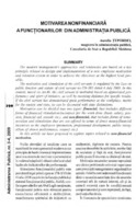 Motivarea nonfinanciară a funcţionarilor din administraţia publică The modern management's approaches and tendencies are based on a key principle related to design and implementation of a new employee motivation and retention system in order to achieve the objectives at the highest level possible. The motivation and stimulation of the civil servants is regulated by the Law on public junction and statute of civil servant no. 158-XVI dated 4 July 200H. In this context, based on Art. 40, the civil servant is motivated based on appreciated per formance and spirit of initiative, as well by receiving diplomas for specific results. If the civil sen-ant has demonstrated great performance at the workplace, merits for the society and state, he can be decorated with state distinctions. Motivation can be divided into two types: financial, that includes different forms of financial stimulation/incentives for the work done (basic salaiy, pension, financial aid. awards etc.), and non-financial, that includes forms of remuneration and stimulation that are not offered in terms of direct money/financial incentives to the employees (promotion, professional development, public recogCT) nition of shown performance, respect etc.). In this article we have proposed to explore topics related to non-financial motivation.