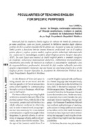 Peculiarities of teaching english for specific purposes Interesul faţă de studierea limbii engleze în calitate de limbă de comunicare pe teme cotidiene, care era foarte populară în Moldova imediat după căderea cortinei de fier, a scăzut considerabil în ultimii ani. Accentul se pune pe studierea limbii pentru a funcţiona într-un anumit domeniu profesional cum ar fi engleza pentru afaceri, engleza pentru medici, engleza pentru tehnologii informaţionale etc. cunoscută în metodologia predării drept Engleza pentru Scopuri Specifice (ESP). In cazul lipsei urnii manual de limba engleză pentru o anumită categorie de studenţi, selectarea materialelor didactice, elaborarea curriculumului, organizarea procesului de instruire şi evaluare a cunoştinţelor studenţilor ţine de responsabilitatea profesorului. Articolul de faţă conţine reflecţiile autorului asupra componentelor enumerate mai sus bazate pe experienţa proprie de a preda Engleza pentru Scopuri Specifice la Academia de Administrare Publică de pe lîngă Preşedintele Republicii Moldova.