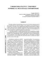 Comunicarea politică - component intrinsec al vieţii sociale contemporane Nowadays, political communication has become an intrinsic component part of the social life and more and more public servants display an increased interest in this activity. Generally, it can be affirmed that political communication is a field in which various persuasive modalities and forms of the electorate are intersected. The article analyses the proposed by different specialists I the field definitions in order to identify the specifics of political communication. The author proposes a succinct characteristic of the essential forms of political communication such as: presidential communication, governmental communication, local communication, party communication, electoral communication. The peculiarities of the political marketing and of its instruments in political communication are also specified. The aim of the article is to initiate the readers into the essence of the topic.