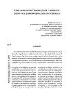 Evaluarea performanţelor cadrelor didactice şi managerilor educaţionali The evaluation of professors and educational managers is treated in the article. The notion of performance and its characteristics are also clarified. The standards of performance of professors and managers and the indices of standards are being discussed. Performance evaluation is proposed according to the criteria possessing a certain goal and objectives. The evaluation stages, methods, techniques, and errors are set.