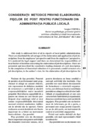Consideraţii metodice privind elaborarea fişelor de post pentru funcţionarii din administraţia publică locală This study is addressed first of all to experts of local public administration. There are elucidated the advantages of the elaboration and application of job descriptions from the employees’ perspective and from the employers’ perspective. It is analyzed the legal support and there are determined the responsibilities of local factors of decision concerning the elaboration of job descriptions. There are presented and described the constitutive leading elements of a job description. In the completion of theoretical reflections it is presented a model structure of a job description, in the author’s view.