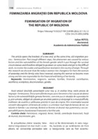 Feminizarea migrației din Republica Moldova Acest articol deschide parantezele unui nou și, în același timp, vechi proces de migrație - feminizarea. Trecut prin diferite etape, acest fenomen a fost cauzat de diverși factori și de vulnerabilitațile genului feminin, care este pus în situația de supraviețuire și, prin urmare, obligat sa coboare pe anumite paliere și sa ajunga la o munca dificila, indiferent de studiile și calificarea primita în țara de origine. Prin intermediul acestei cercetari descoperim ca femeia de astazi s-a schimbat mult fața de femeia de ieri, iar rolurile în familie s-au inversat, facând ca femeia sa devina mai puternica și cea responsabila pentru bunastarea financiara a familiei sale.