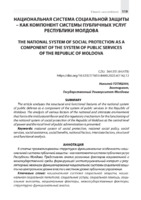 Национальная система социальной защиты как составная часть системы государственных услуг Республики Молдова В статье анализируются структурно-функциональные особенности национальной системы общественной обороны как составной части системы государственных услуг в Республике Молдова. Анализ различных факторов национальной и межгосударственной среды формирует институциональную среду и регулирующий механизм функционирования национальная система социальной защиты Республики Молдова на центральном уровне власти и местного уровня государственного управления.