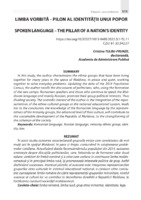 Limba vorbită - pilon al identitații unui popor În acest studiu autoarea caracterizeaza grupurile etnice care conviețuiesc de mai mulți ani în spațiul Moldovei, în pace și liniște, conlucrând în soluționarea problemelor cotidiene. Actualizând datele Recensamântului populației din 2014, autoarea amintește despre discuțiile politicienilor, care, folosindu-se de formarea celor doua tabere: vorbitori de limba româna și a celor care vorbesc în continuare limba moldoveneasca și în principal limba rusa, își promoveaza interesele politice de grup. Astfel dezbinând societatea. Interesul științific al autoarei este: integrarea reprezentanților grupurilor etno-culturale în sistemul educațional național, o conduce catre concluzia: cunoașterea limbii române de catre reprezentanții grupurilor minoritare, nivelul avansat al culturii lor va contribui la dezvoltarea durabila a Republicii Moldova, la fortificarea coeziunii societații moldovenești.