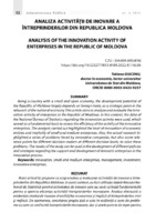 Analiza activității de inovare a întreprinderilor din Republica Moldova Acest articol își propune ca scop analiza și evaluarea activitații de inovare a întreprinderilor din Republica Moldova. In acest context, au fost utilizate datele Biroului National de Statistica privind activitatea de inovare care au sevit ca baza fundamentala pentru a aprecia eficiența activitații întreprinderilor inovatoare. Analiza efectuata a evidențiat nivelul de inovare al entitaților economice și implicit al întreprinderilor mici și mijlocii. De asemenea, cercetarea propiu zisa a scos în evidența o serie de probleme cu care se confrunta intreprinderile inovatoare, dar și unele puncte de reper pentru diferiți decidenți la diferite nivele de decizie, în scopul soluționarii acestor probleme. Rezultatele studiului poate fi utilizat în elaborarea diferitor politici și strategii privind susținerea și dezoltarea intreprinderilor autohtone în procesul de inovare.