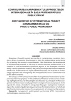 Configurarea managementului proiectelor internaționale în baza parteneriatului public-privat Parteneriatul public-privat în condițiile contemporane devine un driver al dezvoltării economice, o bază pentru modernizare şi un factor pentru creşterea competitivității țării, care determină dezvoltarea potențialului de infrastructură sub forma construcției şi modernizării unui complex de obiecte semnificative din punct de vedere socio-economic. Fiind o realitate promovată relativ recent în țările dezvoltate, parteneriatul public-privat înglobează resurse intelectuale, instituționale şi organizaționale şi capătă un rol din ce în ce mai important în integrarea structurii manageriale în administrațiile publice centrale şi locale. Analiza configurării managementului proiectelor internaționale de parteneriat public-privat, în condițiile instabilității financiare şi economice, evidențiază problematica atragerii sectorului privat la participarea în gestiune şi finanțare a proiectelor de infrastructură strategice semnificative din punct de vedere social. În acest sens prezentul articol este menit să extrapoleze metodologia de management a proiectelor în contextul parteneriatului public-privat, implementarea cărora poate îmbunătăți semnificativ procesul de management a proiectelor de parteneriat public-privat.