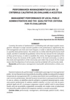 Performanța managementului APL și criteriile calitative de evaluare a acesteia În prezent noțiunea de „performanță” se infiltrează cu paşi siguri şi în managementul public. Tot mai frecvente sunt încercările de a le atribui calități concrete performanțelor înregistrate de managementul APL, în vederea identificării unor posibilități de cuantificare a acestor performanțe. Articolul încearcă să precizeze ce presupune performanța în sine ca, ulterior, să identifice criteriile calitative ce prezintă relevanță pentru evaluarea acestor performanțe. În vederea stabilirii criteriilor s-a ținut cont atât de prerogativele legale ale APL ce presupun asigurarea creşterii calității vieții în comunitatea locală, cât şi de necesitățile şi aşteptările comunității, din simplu motiv că obiectivele funcționarilor publici trebuie să fie neapărat corelate cu nevoile comunității.