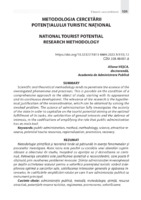 Metodologia cercetării potențialului turistic național Metodologia ştiințifică şi teoretică tinde să pătrundă în esența fenomenelor şi proceselor investigate. Acest lucru este posibil cu condiția unei abordări cuprinzătoare a obiectului de studiu, începând cu apariția sa şi dezvoltarea sa continuă. Relevanța cercetării este justificarea ipotetică a reconsiderării, care poate fi obținută prin rezolvarea problemei invocate. Ştiința administrației investighează pe deplin activitatea statului pentru a valorifica potențialul turistic vizând îndeplinirea optimă a sarcinilor sale, satisfacerea intereselor generale şi apărarea intereselor, în codificările amplificării rolului pe care îl are administrația publică ca instrument principal.