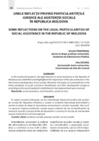 Unele reflecții privind particularităţile juridice ale asistenţei sociale în Republica Moldova În cadrul cercetării efectuate, au fost identificate trăsăturile juridice ale asistenţei sociale din Republica Moldova şi scoasă în evidenţă importanţa primordială a acestei instituţii de drept în dezvoltarea armonioasă a oricărei societăţii. Mai mult, s-a apreciat impactul politicilor sociale asupra nivelului de trai al beneficiarilor de asistenţă socială şi perspectivele de dezvoltare a acestora în funcţie de standardele sociale instituite la nivel internaţional.