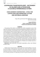 Cooperarea transfrontalieră – instrument de valorificare și promovare a culturii și patrimoniului istoric Scopul acestui articol este de a analiza cooperarea transfrontalieră ca unul dintre instrumentele multifuncționale importante care vizează dezvoltarea relațiilor de bună vecinătate cu statele de la granițele Uniunii Europene, precum şi sprijinirea dezvoltării economice şi sociale şi promovarea valorilor europene în țările partenere, în contextul extinderii UE. Obiectivele pe termen lung ale proiectelor de cooperare transfrontalieră vizează: crearea mai multor beneficii bilaterale; îmbunătățirea infrastructurii fizice şi economice; dezvoltarea resurselor umane ale regiunii; aprofundarea legăturilor culturale şi educaționale; pregătirea pentru aderarea la UE; protecția mediului etc. Cooperarea transfrontalieră este favorizată de moştenirea culturală, moştenirea etno-lingvistică, moştenirea istorică sau prezența minorităților naționale. Comunitatea românească din Ucraina sau comunitatea ucraineană din România, moştenirea etno-lingvistică comună a populației României şi Republicii Moldova sunt elemente favorabile în procesul de cooperare transfrontalieră.