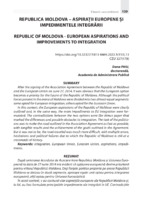 Republica Moldova – aspirații europene și impedimentele integrării După semnarea Acordului de Asociere între Republica Moldova şi Uniunea Europeană la data de 27 iunie 2014 era evident că opțiunea europeană devine prioritară pentru viitorul Republicii Moldova. Deşi forțele politice prezente pe arena Republicii Moldova se divizau în două segmente, aproape egale: unii optau pentru integrarea europeană, alții optau pentru Uniunea Euroasiatică. În acest context, s-au conturat clar aspirațiile europene ale Republicii Moldova şi, la fel, au fost formulate principalele impedimente ale integrării în UE. Contradicțiile dintre cele două opțiuni au fost ca hârtia de turnesol care a marcat diferențele şi posibilele obstacole în calea integrării. Sarcina politicienilor a fost ca drumul conturat în cadrul Acordului de Asociere să fie parcurs cât mai rapid, cu rezultate palpabile şi atingerea scopurilor schițate în Acord. Dar n-a fost să fie, drumul parcurs a fost mult mai anevoios, cu multiple erori, ezitări şi cedări politice din care cauză Republica Moldova şi astăzi se găseşte la o răscruce a istoriei.