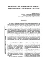 Promovarea politicii de stat în domeniul serviciului public din Republica Moldova The author of the present article analyzes the complex of methodological and didactic activities, their efficiency and role regarding the contribution of the Academy of Public Administration, Office of the President of the Republic of Moldova, in the promotion of the State policy in the field of public service in our country. The scholar mentions that the Academy’s Action Plan regarding the development and capacity strengthening has recently been elaborated. It essentially contributes to the edification of the democratic state of law and to the effectiveness of the activity of the system of public authorities at all levels. In the context of the fulfillment of the stringent opportunities for a more efficient promotion of the State policy in the field of public administration, the optimization of the training and evaluation system of the personnel, as well as, the need for the consolidation of the organizational, methodological and scientific basis of the activity of public authorities, the rector of the Academy underlines that the Senate has established the priority direction of research for the academic personnel, and namely “The edification of the state of law and the consolidation of the public administration.