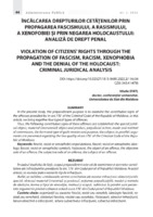 Încalcarea drepturilor cetățenilor prin propagarea fascismului, a rasismului, a xenofobiei și prin negarea holocaustului: analiză de drept penal În cadrul studiului de fața, scopul preponderent este cel de examinare a semnelor constitutive ale infracțiunilor prevazute la art. 1761 din Codul penal al Republicii Moldova. În acest articol, se reunesc patru variante-tip de infracțiuni. Astfel, se stabilesc urmatoarele semne constitutive ale acestor infracțiuni: obiectul juridic special, obiectul material (imaterial) și produsul, acțiunea prejudiciabila, modul și metoda de savârșire, forma și tipul de vinovație, motivul și scopul, subiectul. În paralel sunt prezentate argumente privind calitatea redusa a art.1761 din Codul penal al Republicii Moldova.