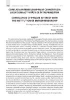 Corelația interesului privat cu instituția licențierii activității de întreprinzător Prezentul articol are drept scop analiza complexa a conceptului de interes privat și identificarea acestuia atât în reglementarile cadrului legal național, dar și din alte state, cât și tratarile doctrinare ale acestui concept în literatura juridica de specialitate. Conceptul de interes privat este în strânsa legatura cu conceptul de interes public și cu licențierea activitații de întreprinzator, or, interesul public nu reprezinta altceva decât o mulțime de interese private, iar licențierea anumitor activitați are rolul de a proteja interesul public. Reglementarile juridice în care identificam conceptul de interes privat, au menirea de a proteja persoana fizica, juridica, întreprinzatorul și orice subiect al raporturilor juridice, de intervenția excesiva, uneori abuziva din partea statului în activitatea licențiata de întreprinzatori. Astfel, interesul privat este drept un garant al neingerinței neîntemeiate în activitatea subiecților privați de a practica o anumita activitate licențiata. Totodata, combinarea intereselor private și publice reprezinta o noua paradigma a reglementarii de stat a economiei la general, inclusiv a activitați de întreprinzator prin licența în mod special.