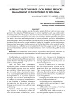 Alternative Options for Local Public Services Management in the Republic Of Moldova The paper’s author analyzes several alternative options for local public services management in the Republic of Moldova, based on current legal framework and existing administrative practice. For this purpose, the need to choose an alternative management option was analyzed; alternative options were listed; and an analysis of each option was performed. The paper’s perceived need emerged from an existing situation, typical for the Moldovan local government, where management can only be one of the two traditional ones - direct or delegated, both generating enough problems (studied by the author in other publications). However, local government is often unaware of the fact that it has other perfectly legal alternative options. A reflection chart is included at the end of the paper in order to help local government select the optimum management option when it comes to the public services delivery.