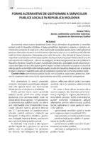 Forme alternative de gestionare a serviciilor publice locale în Republica Moldova În prezentul articol autorul analizează unele forme alternative de gestionare a serviciilor publice locale în Republica Moldova, în baza prevederilor legislaţiei în vigoare şi a practicii administrative existente. În acest sens, a fost examinată necesitatea optării pentru alternativele de gestiune, efectuată o trecere în revistă a acestor alternative, precum şi s-a realizat analiza fiecărei astfel de forme alternative. Necesitatea unui astfel de studiu a fost dictată de faptul că pentru majoritatea autorităţilor administraţiei publice locale gestiunea nu poate îmbrăca decât una din cele două forme tradiţionale – directă sau delegată, ambele însă generând destule probleme în Republica Moldova (studiate de autor în publicaţii anterioare), autorităţile locale respective necunoscând faptul că au şi alte opţiuni perfect legale. La finele articolului se conţine o schemă de reflecţie pentru autorităţile administraţiei publice locale din Republica Moldova care ar putea să le ajute în alegerea modalităţii adecvate de organizare şi gestionare a serviciilor publice locale.