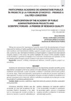Participarea Academiei de Administare Publică în proiecte și la forumuri științifice - premisă a calității cercetării Academia de Administrare Publică, ținând cont de importanţa cercetării ştiinţifice pentru dezvoltarea cunoaşterii şi formarea cadrelor de înaltă calificare, pune accent pe excelenţă şi vizibilitate internaţională, susţine cercetările complexe în domeniile administrație publice, economie, drept, relații internaționale și participarea în proiectele de cercetare naționale și internaţionale. În articol, autorul evidențiază misiunea cercetării ştiinţifice în Academie de a genera cunoaştere şi de a transmite, difuza şi valorifica cunoștinţele acumulate prin cercetarea ştiinţifică în activitatea administrativă.