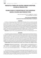 Percepția tinerilor asupra Uniunii Europene. Viziuni și perspective În societatea actuală, percepția tinerilor despre Uniunea Europeană este foarte importantă, mai ales în contextul în care aceasta se confruntă cu diferite crize. În acest context, percepția tinerilor și modul în care aceștia au încredere în Uniunea Europeană reprezintă o bază foarte importantă pentru viitorul UE. în acest sens, metodele folosite pentru a afla percepția tinerilor despre Uniunea Europeană au fost chestionarul online și focus-grupul, aflându-se gradul de încredere pe care tinerii îl au în UE, dar și viziunile și percepțiile acestora despre UE și viitorul acesteia. Cert este că modul în care tinerii percep Uniunea Europeană este vital pentru dezvoltarea armonioasă a acesteia și perpetuarea valorilor europene de către tânăra generație.