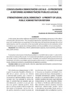 Consolidarea democraţiei locale – o prioritate a reformei administraţiei publice locale În prezentul articol autorul abordează problema consolidării democraţiei în cadrul reformei administraţiei publice locale. Sunt examinate abordările conceptuale privind democraţia locală, scopul şi manifestările acesteia. Totodată, este analizată interacţiunea dintre administraţia centrală şi autorităţile administraţiei publice locale în consolidarea democraţiei locale, problemele existente şi posibilităţile de depăşire a acestora.
