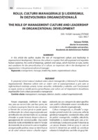 Rolul culturii manageriale şi liderismul în dezvoltarea organizaţională În prezentul articol autorul studiază rolul culturii manageriale și liderismul în dezvoltarea organizațională. Deoarece cultura este un sistem care se autoorganizează şi prin care se reglementează existenţa umană, lumea sensurilor, simbolurilor şi valorilor, care funcţionează ca reguli, norme şi condiţii pentru personificarea unei culturi, un rol important în dezvoltarea organizațiilor îl are cultura personală a managerului.