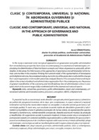 Clasic şi contemporan, universal şi naţional în abordarea guvernării şi administraţiei publice În prezentul studiu se examinează unele abordări conceptuale privind guvernarea şi administraţia publică din perspectivă evolutivă, de la clasic spre contemporan, în aspect universal şi naţional, evidenţiind rolul factorilor istorici determinativi ai concepţiilor şi viziunilor privind guvernarea şi administraţia publică. În acest sens, sunt analizate izvoarele iniţiale ale abordărilor guvernării şi administrării comunităţilor umane în gândirea înaintaşilor din lumea antică, ale reprezentanţilor epocilor Renaşterii şi Iluminismului, redimensionările conceptuale, datorită ascensiunii modului de producţie şi modificărilor din organizarea socială în perioada modernă. În baza acestor viziuni conceptuale în permanentă evoluţie şi în contextul realităţilor organizării politice şi administrative din epoca contemporană se analizează procesul de cristalizare treptată a ideii autonomiei şi interdisciplinarităţii ştiinţei administraţiei, care la etapa actuală se manifestă plenar atât în aspect universal, precum şi naţional.