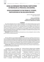 Buna guvernare prin prisma participării cetăţenilor la procesul decizional Articolul subliniază rolul participării cetăţenilor în procesul de luare a deciziilor la nivel local. În articol se analizează necesităţile participării cetăţenilor la gestionarea afacerilor publice pentru asigurarea bunei guvernări la nivel local. Este analizat cadrul normativ care reglementează implicarea cetăţenilor în procesul decizional. Sunt descrise formele şi metodele de participare a cetăţenilor în procesul decizional şi sunt analizate responsabilităţile în acest proces atât a autorităţilor administraţiei publice locale, precum şi a cetăţenilor. Sunt descrise beneficiile implicării cetăţenilor în procesul decizional.