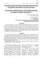 Evaluarea serviciilor de dezvoltare profesională în vederea asigurării calității acestora În prezentul articol sunt abordate unele aspecte organizatorice și metodologice ale evaluării activităților de dezvoltare profesională a funcționarilor publici. Sunt descrise prevederile legale care reglementează activitățile de dezvoltare profesională în general și evaluarea calității acestora, în special. De asemenea, articolul conține informații privind factorii implicați în procesul de evaluare a instruirii, instrumentele care sunt utilizate la diferite etape pentru evaluarea calității instruirii.