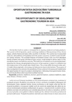 Oportunitatea dezvoltării turismului gastronomic în Asia La fel ca însuși Orientul, bucătăria sa este renumită pentru misterul său, exotismul și produsele picante. Bucătăria este plină de mistere, secretele și tradițiile îndelungate ale misterioasei Chine, Japoniei festive, Coreei multicolore și ale multor altor țări din Est. Această bucătărie a încorporat tradiții vechi de secole de ospitalitate din țările de est, cărora le datorează varietatea strălucitoare de gusturi. Caracteristicile esențiale ale bucătăriei orientale este utilizarea unei varietăți abundente de ierburi și mirodenii, tot felul de sosuri picante, carne gătită în diverse moduri pe foc, dulciuri minunate și produse de patiserie delicioase. Tradițiile bucătăriei orientale sunt determinate în mare măsură de climă, de locația geografică a țărilor în care este inerentă și de temperamentul oamenilor care le locuiesc. Bucătăriile diferă una de alta, ce le face enigmatice, interesante și obiectul destinațiilor turistice. Obiectul investigației este estimarea specificului acestor bucătării din zonă și determinarea oportunităților de formare a produselor turistice. Depistarea acestor particularități gastronomice ar permite și altor țări, bucătării naționale să atragă turiștii.