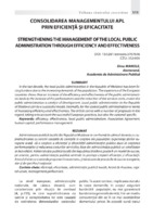 Consolidarea managementului APL prin eficienţă şi eficacitate Administrarea publică locală din Republica Moldova se confruntă în ultimul deceniu cu supraîncărcarea cu sarcini cauzată de cerinţele în creştere ale populaţiei. Experienţa ţărilor europene arată că o creştere a eficienţei şi eficacităţii administraţiei publice duce la creşterea performanţelor şi reducerea costurilor serviciilor, face din administraţia publică un catalizator al dezvoltării. Administraţia publică locală din Republica Moldova poate fi un model de succes, pe interior, pentru administraţia publică centrală în privinţa creşterii eficienţei şi eficacităţii. Articolul vine cu o serie de propuneri în acest sens, ţinând cont de practicile de succes europene, dar şi de specificul naţional.