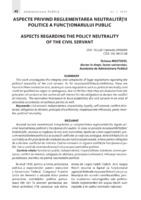 Aspecte privind reglementarea neutralităţii politice a funcţionarului public Această lucrare examinează integritatea și complexitatea reglementărilor legale privind neutralitatea politică a funcționarului public. În ceea ce privește incompatibilitățile/ interdicțiile, acestea se regăsesc în trei acte normative, lipsite de unele reglementări, precum neutralitatea politică și ar putea fi calificate ca vagi sau ambigue, datorită faptului că sunt deduse din principiile de conduită sau din noțiunea personală, interes pentru obligația de a declara conflictul de interese. Cadrul normativ în vigoare stabilește funcționarul public într-o zonă de incertitudine extinsă și asupra partidelor politice.