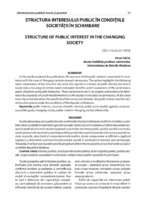 Structura interesului public în condițiile societății în schimbare În articolul propus spre publicare este examinată structura interesului public în corelație cu problematica societății în schimbare spre democrație. Autorul pune în valoare următoarele componente principale ale structurii: actorul (agentul) ca purtător de interes public; poziția socială a actorului, axată pe anumite necesități și avantaje publice; gradul de conștientizare de către actor a poziției sociale; scopurile, obiectivele și comportamentele publice. Aceste componente se află într-o legătură organică și determină caracterul transformărilor sociale în societatea în tranziție spre democrație. Totodată, în articol este elucidat specificul legăturii dintre interesul public și transformările sociale în condițiile Republicii Moldova.