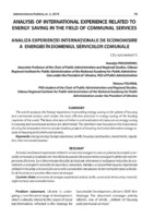 Analysis of international experience related to energy saving in the field of communal services The article analyzes the foreign experience in providing energy saving in the sphere of housing and communal services and studies the most effective practices in energy saving of the leading countries of the world. The basic directions of reforms and realization of measures on energy saving in housing and communal services are determined. The attention was focused on the importance of using the innovative thermo-modernization projects of housing stock and alternative energy sources in housing and communal services.