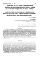 Bune practici de creare și promovare a imaginii autorităților administrației publice locale în comuna Șolcani, raionul Soroca În prezentul articol, autorii studiază unele bune practici de creare şi promovare a imaginii autorităţilor administraţiei publice locale din comuna Şolcani, raionul Soroca, în condiţiile în care autorităţile locale nu dispun de o structură specializată de relaţii publice şi nici de resursele necesare pentru contractarea unor imagemakeri din exterior. Administraţia publică locală din Şolcani posedă totuşi o experienţă solidă în formarea şi promovarea imaginii – atât a autorităţilor administraţiei publice locale, cât şi a localităţii în genere. În acest sens, pot fi identificate anumite bune practici inovative şi replicabile – gestionarea unor surse de imagine, utilizarea transferului de imagine, promovarea imaginii prin intermediul evenimentelor promoţionale, utilizarea mass-mediei locale ca sursă de imagine, folosirea reţelelor sociale ca instrument de promovare a imaginii etc.