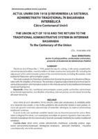 Actul Unirii din 1918 și revenirea la sistemul administrativ tradițional în Basarabia Interbelică. Către Centenarul Unirii Actul Unirii de la 01 decembrie 1918 a deschis calea spre soluționarea, în realitățile politice și teritoriile nou-create, a mai multor probleme ale construcției statale și vieții publice, inclusiv ale ajustării sistemului administrativ al teritoriilor reîntregite, la sistemul administrativ tradițional românesc. În acest studiu sunt analizate condițiile istorice care au favorizat procesul de unire a Basarabiei cu Regatul României, sunt evidențiate activitățile de ajustare treptată a sistemului administrativ basarabean de nivel provincial și local din perioada interbelică la modelul tradițional românesc.