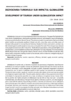 Dezvoltarea turismului sub impactul globalizării Globalizarea în turism este un domeniu important de promisiune și îngrijorare. Acest fenomen evidențiază mai întâi principalele motoare ale globalizării, făcând distincție între factorii de decizie economici, tehnologici, sociali, demografici, de mediu și politici. Progresele înregistrate în domeniul transportului, care au permis mobilitatea rapidă la nivel mondial, sunt deosebit de semnificative. Transportul aerian modern, navele de croazieră, trenurile și alte mijloace de transport permit turiștilor să se deplaseze rapid și relativ ieftin. Trenurile rapide, sistemele rutiere și chiar programele de închiriere a bicicletelor în orașe permit oamenilor să se miște, să viziteze și să exploreze lumea. Aceste schimbări au permis mai multor persoane să călătorească mai des într-un timp mai scurt. Companiile multinaționale, care oferă zboruri, transport local, cazare și mâncare, au permis „one-stop shopping” pentru rezervările de călătorie. Dispozitivele portabile au schimbat, de asemenea, natura călătoriei în ceea ce privește ceea ce fac călătorii și modul în care acestea interacționează cu o destinație, facilitând, de exemplu, selectarea unui restaurant, navigarea într-un orașmare sau traducerea în limbi străine. Scopul cercetării constă în investigarea factorilor principali, care influențează dezvoltarea turismului internațional în condițiile globalizării și modul de raliere la ei.