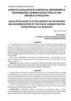 Aspecte legislative în contextul reformării și modernizării administrației publice din Republica Moldova Evoluția administrației publice în ansamblu, privită prin prisma unei analize profunde a situației actuale din domeniu, cunoaște o dezvoltare continuă și demonstrează cert că, atât Parlamentul cât și Guvernul Republicii Moldova își aduc plenar contribuția la aceste importante procese de modernizare a administrației publice în scopul asigurării modului de funcționare democratic și autonom al acesteia, cu capacitatea și resursele necesare pentru a furniza servicii publice conform necesităților și cerințelor cetățeanului prin sincronizarea acţiunilor pe întregul palier al administraţiei publice la toate nivelurile. Apropierea Republicii Moldova de Uniunea Europeană se poate produce doar în condițiile unui stat în care funcționează structuri descentralizate, transparente și dinamice, întemeiate pe supremația legii, a drepturilor și libertăților civile.