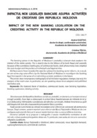 Impactul noii legislații bancare asupra activității de creditare din Republica Moldova Sfera bancară din Republica Moldova constituie, probabil, un domeniu ce trezește interesul întregii societăți. Acest fapt se datorează, în primul rând, fraudei bancare de miliarde de lei și, în al doilea rând, falimentelor scandaloase ale băncilor comerciale. Ambele fenomene au golit atât Bugetul de Stat cât și buzunarele persoanelor fizice și juridice. Toate aceste evenimente au relevat necesitatea unor reforme de substanță ale domeniului bancar. Drept urmare, suntem martorii unor eforturi ale Băncii Naționale a Moldovei de a reconfigura cadrul juridic bancar în sensul neadmiterii pe viitor a unor probleme sistemice. Demersul științific nu-și propune o radiografie a tuturor modificărilor normative de ultimă oră, ci doar analiza principalelor dintre ele. În particular, este vorba de trei acte normative adoptate și publicate.