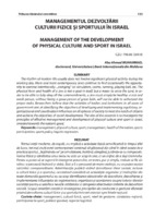 Managementul dezvoltării culturii fizice și sportului în Israel Ritmul vieții moderne, de regulă, nu implică o activitate fizică semnificativă în timpul zilei de lucru, tot mai mulți evrei contemporani continuă să găsească din când în când ocazia de a practica sportul, ,,legănându-se” pe simulatoare, înotând, alergând, jucându-se cu mingea etc. Forma fizică și sănătatea unui evreu nu este un scop în sine, ci un mijloc de a sluji Domnului. Pentru a putea să se supună în întregime poruncilor, un evreu, pur și simplu, trebuie să fie sănătos: o persoană bolnavă și slabă, fără a fi o persoană de mare credință, nu va putea rezista sarcinilor corespunzătoare. Administrația publică vizând dezvoltarea sferei sociale, inclusiv a culturii fizice și a sportului, cercetătorii consideră că activitățile organelor și instituțiilor din toate domeniile guvernului au ca scop identificarea obiectivelor de dezvoltare, dezvoltarea și implementarea influențelor de reglementare, organizare și coordonare asupra tuturor sferelor societății pentru a satisface nevoile cetățenilor și atingerea obiectivelor stabilite de dezvoltare socială. Scopul cercetării constă în investigarea principiilor de conducere și gestiune eficientă privind dezvoltarea culturii fizice și a sportului în Israel orientat spre binele națiunii.