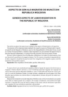 Aspecte de gen ale migrației de muncă din Republica Moldova În acest articol sunt analizate principalele probleme legate de aspectul de feminizare a migraţiei. Analiza datelor statistice a scos în evidenţă aspectele negative ale migraţiei de muncă feminine specifice Republicii Moldova, cum ar fi descalificarea forţei de muncă, precum şi o serie de probleme sociale. Cu toate acestea, migraţia de muncă poate să le ofere femeilor oportunitatea de a deveni libere şi independente, inclusiv din punct de vedere economic şi social. Migraţia feminină de muncă din Republica Moldova este un fenomen obiectiv care poate avea atât un impact pozitiv cât şi negativ. Din aceste considerente, orice politică de reglementare a migraţiei feminine de muncă trebuie să fie axată atât pe atenuarea aspectelor sale negative cât şi pe extinderea aspectelor sale pozitive.