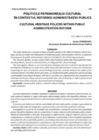 Politicile patrimoniului cultural în contextul reformei administraţiei publice Lucrarea reprezintă o analiză complexă a politicilor publice în domeniul patrimoniului cultural național realizate în cadrul reformelor administraţiei publice din Republica Moldova. Sunt examinate programele de reformă a administraţiei publice în domeniul protejării patrimoniului cultural. În procesul cercetării sunt indicate autorităţile administraţiei publice centrale responsabile de realizarea reformelor de salvgardare a patrimoniului cultural în baza politicilor culturale. Investigația ne-a permis să constatăm că, actualmente, o cerinţă de cea mai mare actualitate pentru Republica Moldova este de a determina în cadrul reformei administraţiei publice modalităţile de îmbunătăţire a formelor de protejare a patrimoniului cultural naţional, precum și de implementare a politicilor publice în acest domeniu. Concomitent, a fost elucidată necesitatea dezvoltării de către autorităţile publice a unui dialog intercultural permanent privind politica culturală cu ţările Uniunii Europene și cooperarea în cadrul forurilor internaționale pentru a dezvolta diversitatea culturală și pentru a conserva și a valorifica patrimoniul național cultural și istoric.