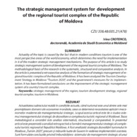 Actualitatea subiectului rezidă în condițiile actuale, când turismul este unul dintre cele mai promițătoare domenii ale economiei mondiale, ceea ce determină necesitatea aplicării mecanismelor moderne ale managementului strategic. Scopul acestui articol este de a studia sistemul managementului strategic de dezvoltare a complexului turistic regional al Moldovei. Baza metodologică a cercetării este analiza sistematică, structurală și comparativă. În prezentul articol este prezentată o analiză retrospectivă a formării managementului strategic al complexului turistic regional al Republicii Moldova. A fost analizată strategia dezvoltării turismului în Moldova ,,Turism 2020”, precum și măsurile luate de Guvern în vederea implementării acesteia. Sunt formulate concluziile privind îmbunătățirea sistemului de management strategic al unui complex turistic al țării.