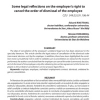 The idea of cancellation of the employer’s unilateral legal acts has been advanced in the specialty literature. This article clarifies the legal status of cancellation of the dismissal order (command, decision, act) by the employer. In addition, there have been highlighted the conditions to be cumulatively met in order to validate such a cancellation act. Based on the research performed, the authors concluded that the employer can cancel the order (command, decision, act) of dismissal of the employee only after obtaining the written agreement of the former employee as the unilateral cancellation cannot produce legal effects.